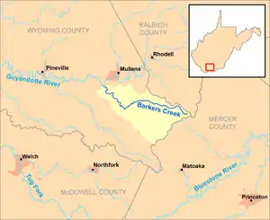 Barkers Creek is a tributary of the Guyandotte River, 8 miles (13 km) long,[3] in southern West Virginia in the United States. Via the Guyandotte and Ohio rivers, it is part of the watershed of the Mississippi River, draining an area of 36.85 square miles (95.4 km2) in a rural area on the unglaciated portion of the Allegheny Plateau.[4]