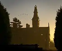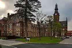 The Barnes Convalescent Hospital was built for the Manchester Royal Infirmary between 1871 and 1875 by Lawrence Booth of the architecture firm of Blackwell, Son and Booth of Bury and Manchester. It is noted for its architectural distinctiveness and as an early example of a purpose-built convalescent hospital. The building was designed on a cruciform plan in the French Gothic Revival style, constructed of red brick and blue brick with ashlar and terracotta dressings, and the roofs are covered with Welsh slate. The building was richly decorated with ornamental brickwork, pointed arched and mullioned windows, decorative ridge tiles. On the western side is the building's main landmark, the tall clock tower, with clock faces on each side and a high two-stage lantern roof topped with an ornamental iron crown. Alterations to the building were carried out in 1893 by Pennington & Bridgen, and again in 1939-45 by Thomas Worthington & Son, both Mancunian architects' firms.[1]