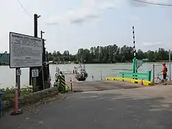 Propelled by an attached tugboat, the barge[31] can carry up to 6 vehicles and 52 passengers, but when 6 vehicles are aboard, the residual capacity is 28 passengers.[32] The crossing time is usually five minutes. The ferry terminal landing is accessed from British Columbia Highway 1 by taking exit 53 into Port Kells, Surrey and proceeding to the end of 104th Avenue.[31]