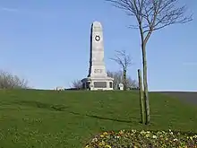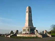 The Barrow Park Cenotaph is the main war memorial in the UK town of Barrow-in-Furness, Cumbria, North West England. Located in Barrow's main public park, the structure is grade II listed. It is made from Portland limestone and is pillar like in appearance.[1] It was built in 1919 in commemoration of the 616 Barrovian men who lost their lives in combat during World War I,[2] however since then the names of 274 more locals have been added (268 of these being fatalities of World War II and 6 of the Korean War).[2] The cenotaph currently only bears the names of Barrovians lost during these three wars whilst in military action (i.e. excluding civilians killed in the Barrow Blitz). Two inscriptions on the memorial read, To the glory of God and in honoured memory of the men of Barrow-in-Furness who fell in the Great War and in honoured memory of all service personnel who gave their lives in the 1939–1945 War. Also Korea and Cyprus campaigns having made the supreme sacrifice that we might live lest we forget.[2]