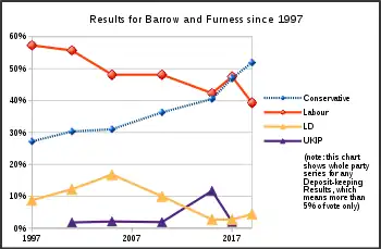 Results for Barrow and Furness since 1997, as to those parties/others who at some point have kept their deposit in this time. This means have won 5% of the vote, or more.