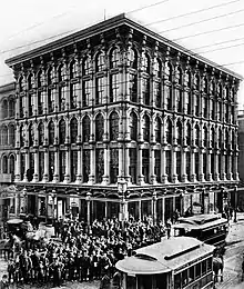 At the death of Jonas H. Hayward in 1866, the company changed its name to Bartlett, Robbins & Co., with David L. Bartlett assuming the role of senior partner and Howard W. Robbins the junior.[56] In the immediate aftermath of the war, the company produced iron-front buildings in the rebuilding South, such as the large Stearns Iron-Front Building in Richmond, Virginia.[57] In the late 1860s, Bartlett & Robbins produced the iron dome of Baltimore City Hall.[58] The company also built iron fronts and shutters for numerous Baltimore industrial buildings, a portico for the Baltimore Basilica and an iron balcony for Barnum's Hotel in Baltimore.[59] The company contributed interior metalwork for the Washington Monument.[25] It also supplied much of the metalwork for the Treasury Building in Washington, D.C.[30]