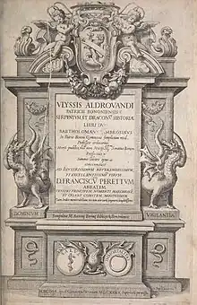 He published several works on botany and medicine, but is perhaps better known by having been commissioned by the Senate of Bologna to edit several volumes of the major works left unfinished by Aldrovandi, including the History of snakes and dragons (Bologna, 1639) and the History of monsters (Bologna, 1642).[2] But Ambrosini also published works of his own, especially of medical and pharmacopeic. His botanical works consist of two small volumes. One of these was on the various plants which have been named after, or dedicated on account of their properties to saints, or called after sacred things. The title of this work is Panacea ex Herbis quæ a Sanctis denominantur concinnata Opus. Bologna, 1630. This book gives an account of the properties, real or supposed, which the plants dedicated to holy persons or things possess. The other botanical work was on the capsicum plant, and has the title De Capsicorum Varietate cum suis Iconibus brevis Historia. Bologna, 1630. It is illustrated with several drawings of the fruits of various species of capsicum, and gives a full detail of their history and properties. In 1657 he published a number of plates from the works of Aldrovandi with short descriptions, entitled Paralipomena accuratissima historiae omnium animalium quae in voluminibus Aldrovandi desiderantur.