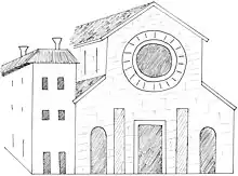 To date there are only two historically reliable and sufficiently clear depictions of the basilica. The first is the miniature on the cover of the Estimo della città di Brescia of 1588, which depicted the eastern side of the Piazza del Duomo, showing the Broletto palace with the Torre del Popolo tower, the Old Cathedral with its campanile (which collapsed in the 18th century), and the basilica itself in an emerging central body with two lower side aisles covered by sloping roofs. A roseate window appears in the upper middle, while below, the entrance portal opens.[5] The building does not quite abut the street (today's Via Querini) but is separated by a set of houses.