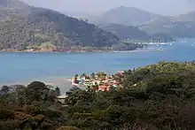 The island shown on Spanish maps made in about 1700 as Isla Grande de Bastimentos (Big Island of Bastimentos) is today known as “Isla Grande”,[1] and is joined by a short reef to the small island on the north called in the old maps Isla de Bastimentos Chica (Little Island of Bastimentos). The natural inlet or harbour 1 km to the south on the mainland is marked as Puerto de Bastimentos (Port of Bastimentos), and an inverted anchor is drawn in its midst indicating the position of the anchorage, with depths marked as 6 and 7 fathoms. However Morison equates Puerto de Bastimentos / El Puerto de Bastimentos de Colon with the port of Nombre de Dios,[10] 7 miles to the east.[8]