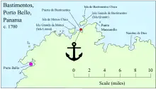 Bastimentos was an island, anchorage and harbour near Portobelo on the north-western coast of Panama discovered and named in Spanish "Isle and port of Provisions" by Christopher Columbus in 1502 during his fourth and last voyage.[2] Although the location of the two adjacent Bastimentos Islands (Great and Little) is largely undisputed, the location of the harbour, shown on several 18th century Spanish maps as on the mainland opposite the islands, is suggested by various modern commentators to lie about 7 miles distant, thus its exact location is now uncertain and a matter of conjecture. Harris (2013) states: "by 1513 the record of (Columbus's) discoveries in this small region had become so clouded that it has since generated countless investigations and over the years a voluminous literature has been created in which attempted reconstructions of the voyage often have been conjectural and controversial".[3] Bastimentos was the place where in 1726/7 the British Admiral Francis Hosier with three thousand of his sailors died of tropical disease whilst anchored with his fleet of 20 ships during the disastrous Blockade of Porto Bello. Due to the popularity of Richard Glover's poem and song Admiral Hosier's Ghost (c.1739), which mentions them twice, the Bastimentos became in England synonymous with "foul dishonour" and "shameful doom". The location should not be confused with Bastimentos Island, Bocas del Toro, 270 km to the west, also discovered by Columbus on his 4th Voyage, before reaching Portobelo.