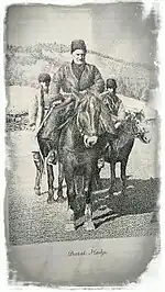 Batal Hajji had a wife, who according to John F. Baddeley, has been respected more than any other Ingush women. She had already died by the time Baddeley had met Batal Hajji in 1901.[30] Batal Hajji had seven sons, most of whom were executed by the Soviets as they bitterly resisted the Bolsheviks. His son Muhammed, for example, was supporter of the Anti-Soviet Imam Nazhmudin Gotsinskii and was executed while trying to flee to Turkey in 1920 or 1921.[41][42] His other son, Qureysh, led a guerilla movement in Chechen-Ingush ASSR and North-Ossetian ASSR, but was caught in 1947 and arrested.[43][42] In 1957, he was released and returned to his homeland, leading the wird up to his death in 1964.[42] Batal Hajji also had his only daughter, named Zaleikha. She was nicknamed 'hama hovsh yolu sag' (хьама ховш йолу саг, "person knowing something") and 'daqha danna sag' (дакъа данна саг, "person who received a blessing") for her abilities to communicate with the jinns, her particular healing abilities, as well as for the amulets and talismans she created.[31]