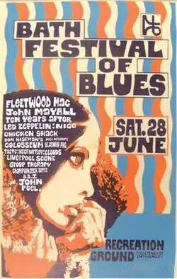 The Bath Festival of Blues was a music festival held at the Bath Pavilion Recreational Ground in Bath, Somerset, England, on Saturday 28 June 1969. It featured a lineup of British blues bands, including Fleetwood Mac (the headliners), John Mayall's Bluesbreakers, Ten Years After, Led Zeppelin, The Nice, Chicken Shack, Jon Hiseman's Colosseum, Mick Abrahams' Blodwyn Pig and Principal Edwards Magic Theatre amongst others.[1]