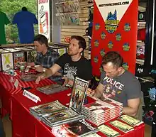 From left to right: writers Scott Snyder and Kyle Higgins, and artist Trevor McCarthy at a signing for issue #1 at Midtown Comics in Manhattan, May 19, 2011.