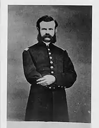 Battery F, 2nd Illinois Light Artillery formed at Cape Girardeau, Missouri, and mustered into federal service on 11 December 1861.[1] The original officers were Captain John Wesley Powell of Hennepin, Illinois, First Lieutenants Michael Dittlenger of Cape Girardeau and Christian D. Bless of Lewistown, Illinois, and Second Lieutenants Gustavus A. Tirmenstein of Cape Girardeau and Joseph W. Mitchell of Bloomfield, Missouri. Rank and file included 1 first sergeant, 4 sergeants, 5 corporals, and 128 privates. The privates were from Missouri and mostly from Cape Girardeau.[2] Powell was promoted to major on 1 September 1864.[3] Powell survived the war and led the first successful voyage through the Grand Canyon in 1869.[4] Powell was replaced as captain by Walter H. Powell of Macon County, Illinois. W. H. Powell mustered out on 15 May 1865 and was replaced as captain by George R. Richardson.[5]