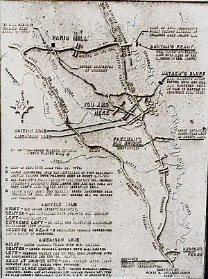 The site at which Ashe made his camp has been criticized by contemporary sources and modern historians. With its back to the creek and swampy lands, its front presented no particular opportunities for defense.[15] Ashe's adjutant, William Bryan recognized some of these problems, and after Ashe left camp on February 28 to attend a war council at Purrysburg, Bryan moved the camp about one mile (1.6 km) north, nearer the Savannah River and a small hill.[14] Ashe returned to the camp on March 2.[16]