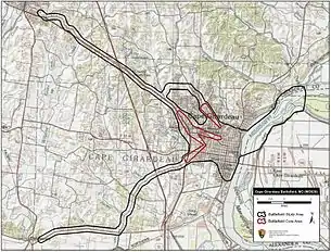 On the night of April 25, in anticipation of the attack, General McNeil ordered the evacuation of women and children via steamboat to a safe location upriver.[19] Also during the night two gunboats and a steamer arrived with additional troops to support McNeil's forces.[20] With the gunboats in place McNeil did not foresee any threat from the Mississippi River side of the city, so he had cannons moved from Forts A and D along the river to Forts B and C on the western side of the city.[18] In all, McNeil's forces totaled about 4,000 men, including supporting regiments from Iowa, Wisconsin, Nebraska, and Illinois,[21] though some of these regiments may have arrived after the action had ended.[20]