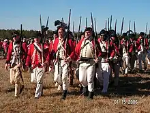 Broken down by troop classification, there were 300 cavalry, 553 regulars, 24 artillerymen, and 281 militia. From these numbers, nearly half of Tarleton's force were Loyalist troops recruited in the colonies (531 out of 1,158). Tarleton's regular troops from the Royal Artillery, 17th Light Dragoons, and the 7th, 16th, and 71st Regiments of Foot were reliable and seasoned soldiers.[47] Tarleton's own Loyalist unit, the British Legion, had established a fierce reputation as formidable pursuers, being used to great effect at Waxhaws and Camden,[48] but had an uncertain reputation when facing determined opposition.[48]