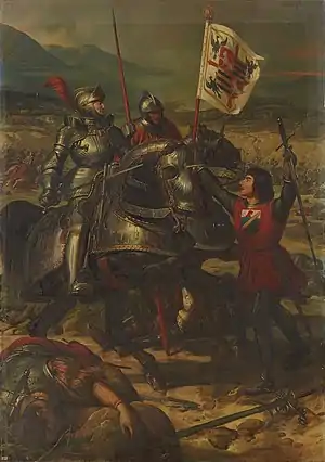 ![]() Bataille de Fornoue, 6 juillet 1495 (oil on canvas by Éloi Firmin Féron, 1837) depicts king Charles VIII on the left and Bayard on the right. | |||||||