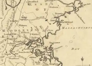 ![]() Detail from a 1775 map showing Boston, Cape Ann and Gloucester harbor. Gloucester Harbor is labelled "Cape Ann Harbour". | |||||||