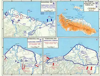 - ↑ International News Service correspondent Richard Tregaskis, whose best-selling Guadalcanal Diary related his experiences during the first seven weeks of the campaign, was attached to this headquarters.