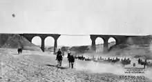 By the afternoon of 2 November 60th (London) Division headquarters and the 180th Brigade group had moved to bivouac about 1.5 miles (2.4 km) south-west of Beersheba, with the 179th and the 181st Brigade group following the next day, before the 180th Brigade moved on during 4 November to bivouac south of El Muweileh, while the 181st Brigade relieved the 230th Brigade (74th (Yeomanry) Division).[21] The capture of the Ottoman line after the victory at the Beersheba, required the capture of Hareira and Sheria, to create a gap sufficiently wide for the Desert Mounted Corps to advance north to Nejile and north-east to Huj, into the Ottoman rear to cut the enemy's lines of retreat.[13] From 1 November the attacks by the Anzac Mounted and the 53rd (Welsh) Divisions and the days and nights of fighting, "played a vital part in the success of the subsequent operations, by engaging the enemy's principal reserves and defeating his counterstroke", while the concentration for the main attack on Sheria went ahead without interference.[22] Although this fierce fighting for control of the high country north of Beersheba resulted in a drawn battle, Desert Mounted Corps was able to advance to gain a "position of vantage from which to roll up the enemy's flank."[23][24][25][26]