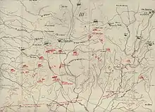 On the western side of the railway, the continuous trench line was strengthened by an almost continuous second line of trenches, connected to the first line by many communication trenches. These fortifications were in the shape of a half moon facing south-east, south and south-west. On the eastern side of the railway the fortifications were not quite so strong, consisting of a series of strong points some as much as 400 yards (370 m) apart, facing south. All the fortifications were well sited and well constructed, although the wire strengthening the defences west of the railway was not thick or continuous, and the defences to the east of the railway had no wire protection.[31][60]