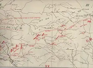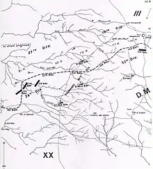 The attack of the XX Corps on the Hareira and Sheria defences was from the south-east towards the north-west, making it possible for the infantry to approach the Ottoman trenches, in enfilade.[59] The Ottoman defences had been built to resist attack from the south. They had proved to be impenetrable from that direction during the Second Battle for Gaza. However, now the 74th (Yeomanry) Division was to launch the preliminary attack from the east, while the main attack by the 60th (London) Division was launched from the south-east.[62]