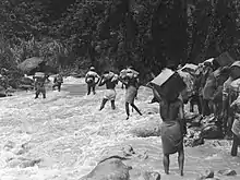 Native carriers bringing supplies across the Faria River to the Australians on John's Knoll after the battle