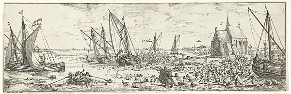 Both sides had suffered high casualties during the fight. Fuenclara's ranks were so depleted that the cardinal-infante reinforced him with 200 infantry from the citadel of Antwerp and 4 companies of cavalry, two of harquebusiers and two of cuirassiers.[34] Men were given a break for the rest of the journey, while Ferdinand ordered a second assault to be carried out the following night. Meantime, as the bad weather prevented Frederick Henry from sending reinforcements from Bergen op Zoom and his troops were exhausted and in a hopeless situation, Count William ordered his men to prepare to re-embark. The 22nd at 12 p. m. the Spanish forces advanced upon the remaining outer works and found them abandoned. At first it was suspected that the Dutch troops had withdrawn into the forts of Kallo and Verrebroek.[32] However, scouts sent to make a reconnaissance reported that both positions had been abandoned. Under the cover the darkness, the States' troops had moved in silence towards Doel and were boarding their boats to cross the canal that separated them from the island, though the low tide and contrary winds prevented them from escaping.[32] They were soon spotted, and the Cantelmo, Lede and Fuenclara, having taken control of the abandoned forts, dispatched their battalions and squadrons forward to attack the retreating Dutch soldiers from three sides.[6] As no units had been left at the rearguard to cover the retreat, panic spread among the States' troops, which broke their ranks aiming at boarding the boats. Count William had already sneaked to Doel, and his subordinates were unable to restore the order. Hundreds of Dutch soldiers threw their weapons and surrendered, while a lage number of those who attempted to escape by swimming across the canal drowned.[32]