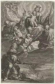 The battle of Kallo had a great repercussion in the Spanish Netherlands. Popular pamphlets attributed to the Jesuit poet Adriaan Poirters and to the journalist and humorist Richard Verstegan, entitled Den Hollantschen Cael-af van Callo and Den ghe-failleerden Facit, which gave humorous accounts of the battle and mocked the Dutch, were distributed shortly after.[54] The battle is central as well in the treatise De Hierarchia Mariana by the Spanish Augustinian friar Bartolomé de los Ríos y Alarcón, who worked as a priest at the Brussels court from 1624 to 1641 and dedicated his work to the cardinal-infante Ferdinand. De los Ríos, who argued about the superiority of Mary over all creatures, attributed the Spanish victory at Kallo to the Virgin.[55] The treaty is accompanied by Neo-Latin poems by different authors; one of them, Caloa, by Franciscus van den Enden, describes the battle of Kallo.[56] The representation of the battle in the plastic arts was also influenced by the religious lecture of the event by De los Ríos. An engraving by Cornelis Galle shows the cardinal-infante kneeling at the feet of Mary with the burning battlefield in distance. Apparently, the Dutch Protestant troops had committed acts of blasphemy after occupying Kallo by smashing images of the patron saints Peter and Paul, and by burning a statuette of the Holy Virgin.[56] Shortly after the battle, De los Ríos founded a Brotherhood of the Slaves of Our Lady of Victory at Kallo and commissioned a polychrome statue of Our Lady of the Victory to adorn its chapel. Many illustrious figures became members of the brotherhood, including the cardinal-infante, Anthonius Triest, bishop of Ghent, and Gaspard Nemius, bishop of Antwerp.[57]