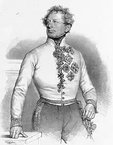 The advance guard of the detachment had two guns, and the Serbian-speaking officer in charge of the advance guard was given the task of trying to get the Serbs to reconcile.[5] Without a fight, the detachment occupied the entrenchment built by the rebels towards Pétervárad and then marched towards the city.[5] When Hrabovsky's detachment arrived in front of the town the Serbian armed force consisting of thousands of border guard soldiers, volunteers, and Servians (volunteers coming from Serbia), was carrying out exercises in a field on the southeast side of the town.[7] The Serbs' surprised commander-in-chief, Đorđe Stratimirović, was at first about to leave the town without putting up any resistance, but then, having changed his mind,[7] and quickly gathered the Servians positioning them behind bushes at the north-western edge of Karlóca, and on the roofs of houses, then he rushed to the troops assembling on the high ground at the south-eastern exit of the town to regroup them.[11] According to Straimirović's memoirs, he sent the two companies of border guards from Pétervárad to the beerhouse, which lied over a very deep canyon towards Pétervárad, but himself went to the opposite direction, to the field, along the road to Zimony, to regroup the peasants who run away.[10] Straimirović writes that when he turned back to Karlóca, he found the border guards he sent to the beerhouse in the city. When he asked why did they not stick to his order, they said that a royal-imperial officer went to them, and said that he (Straimirović) called them back.[10] The Serbian commander sent them back to the beerhouse. He considered this a Hungarian military trick to enable them to capture the city.[10]