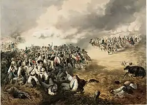 After deploying his troops, Jelačić ordered the Dietrich division to attack Kishegyes. He positioned the cavalry on the two sides, the Rastić brigade constituting the second line, while the Puffer brigade had to attack Szeghegy.[6] As a response the Hungarians withdrew their advanced skirmishers, and unleashed a devastating cannonade on the attackers, which stopped the Austrian attack, forcing some units of the Budissavljević brigade to start a withdrawal, being saved only by the fact that the Hungarian right wing did not attack them. So the brigade finally stopped, and started a fire exchange with the Hungarians.[2] Guyon sent two Hungarian infantry battalions to attack the right wing of the Ban, putting Puffer's brigade in danger.[6] The Budissavljević brigade of the Dietrich division tried a new attack, in order to help the Puffer brigade. However, when, with the support of the whole Hungarian artillery, another battalion joined the two Hungarian battalions, the attackers were forced again to retreat.[6] When the Hungarian cavalry from the right wing attacked the retreating imperials, they were stopped only by the salvos of the Licca battalion and the 4. battalion of the Ban's regiment.[2]
