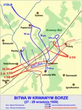 The Battle of Krwawy Bor took place on 27–28 September 1920, during the Polish–Soviet War. The 1st Lithuanian–Belarusian Division, which was part of the Polish Army, clashed with the Soviet Third Army. The battle took place in a forest near the town of Lida (current Belarus). It also is known as the Battle of Lebioda (after the local river) and the Battle of Papiernia (after the nearby village).