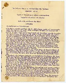 On the next morning, both columns were ordered to launch their attack on Filia, but almost as soon as the Greek advance began, an Ottoman envoy appeared requesting an armistice for negotiations. This was granted, but when the Ottoman commander, Major Abdul Ghani, appeared at 11:00, he claimed that he had not requested negotiations and that he had no proposals to make. Dismissing this as a ploy to gain time, the Greek commander ordered the resumption of the offensive at 14:00. At 22:00, however, the same Ottoman envoy appeared, carrying a letter of surrender signed by the officers of the Ottoman garrison.[9] Syrmakezis ordered an immediate cessation of hostilities, and the instrument of surrender of the Ottoman garrison was signed at 08:00 on the next day.[16]