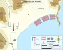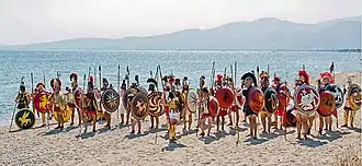 For approximately five days the armies therefore confronted each other across the plain of Marathon in stalemate.[35] The flanks of the Athenian camp were protected by either a grove of trees or an abbatis of stakes (depending on the exact reading).[38][39] Since every day brought the arrival of the Spartans closer, the delay worked in favor of the Athenians.[35] There were ten Athenian strategoi (generals) at Marathon, elected by each of the ten tribes that the Athenians were divided into; Miltiades was one of these.[40] In addition, in overall charge, was the War-Archon (polemarch), Callimachus, who had been elected by the whole citizen body.[41] Herodotus suggests that command rotated between the strategoi, each taking in turn a day to command the army.[42] He further suggests that each strategos, on his day in command, instead deferred to Miltiades.[42] In Herodotus's account, Miltiades is keen to attack the Persians (despite knowing that the Spartans are coming to aid the Athenians), but strangely, chooses to wait until his actual day of command to attack.[42] This passage is undoubtedly problematic; the Athenians had little to gain by attacking before the Spartans arrived,[43] and there is no real evidence of this rotating generalship.[44] There does, however, seem to have been a delay between the Athenian arrival at Marathon and the battle; Herodotus, who evidently believed that Miltiades was eager to attack, may have made a mistake while seeking to explain this delay.[44]