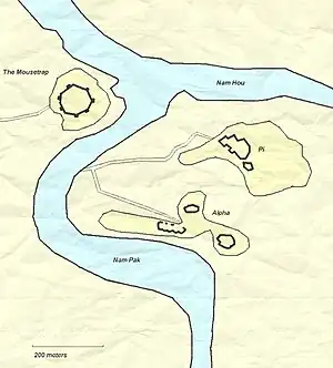 Muong Khoua, together with its satellite outpost Sop-Nao, was under the command of Captain Teullier, with the satellite outpost being overseen by Lieutenant Grézy. Muong Khoua was situated at the confluence of the rivers Nam Pak and Nam Hou, 40 miles (64 km) from Điện Biên Phủ, and approximately 100 miles (160 km) to the south-west of the Black River in Vietnam.[2] The outpost itself consisted of three separate strongholds, referred to as the Mousetrap, Pi and Alpha, situated on three hills to the west, south-south-east, and south-south-west of the confluence of the Nam Hou and Nam Pak. Each was roughly 220 yards (200 m) from the other, forming a triangle. The village of Muong Khoua itself lay at the western foot of the Mousetrap, protected from the river by a large sandbank, and straddling the road to Phong Saly, another French outpost 50 miles (80 km) to the north.[1]