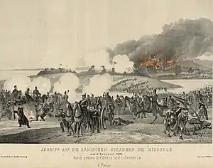 A dense fog this morning made it extremely difficult to determine enemy movements, and consequently only a few shots were fired from the Danish guns in the bastions as the Prussians closed in on Mysunde. At 11:30, the 1st Battalion of the 3rd Danish Regiment arrived at Mysunde under the command of Captain Arntz, and along with a squadron of dragoons, the force carried out a reconnaissance in front of the bastions. A thousand paces in front of the bastions, they encountered the fusilier battalions of the 15th and 24th Prussian Regiments and came under intense fire. Lieutenant Hagemann of the 24th Regiment was the first Prussian officer to be killed, but Major v. Krohn lead the Fusilier Battalion in a bayonet attack that threw the Danish infantry back. With several officers wounded or killed, Captain Arntz ordered his battalion into position at the bastions. It is only at this point, that the Danish commanders realised that they were facing not just a Prussian reconnaissance force, but an actual assault on the fortifications.[3][4][5]