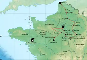 - ↑ He was following, almost exactly, the route of King Edward's great chevauchée of 1359.[26]