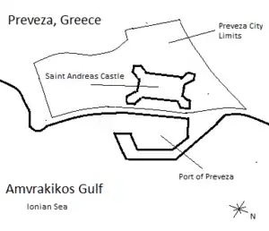 In 1911, the Ottoman Navy maintained a small anti-smuggling force of six torpedo boats dispersed along the Albanian coast, patrolling between Preveza, Gomenítza, and Durazzo.[1] At that time, the Preveza detachment consisted of the torpedo boats Tokad, Antalya, Hamidiye, and Alpagot, the armed yacht Trablus, and the small gunboats No. 9 and No. 10. The unit was commanded by Binbasi (Captain) Tevfik.[2] At Preveza, the Ottomans relied upon a series of obsolete fortifications for local defense, including some that had been erected in the 1400s. The defensive works were armed with a total of five 150 mm (5.9 in) Krupp guns and twenty field guns. The primary fortress was the Castle of Saint Andrew, built in the early 1800s, but reequipped with some modern artillery. It was supported by Fort Pantokrator, of a similar age, and a modern coastal artillery battery of two 210 mm (8.3 in) guns.[3]