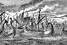 According to Herodotus, the Persian fleet initially numbered 1,207 triremes.[63] However, by his reckoning they lost approximately a third of these ships in a storm off the coast of Magnesia,[64] 200 more in a storm off the coast of Euboea,[65] and at least 50 ships to Allied action at the Battle of Artemisium.[65][66] Herodotus claims that these losses were replaced in full,[67] but only mentions 120 ships from the Greeks of Thrace and nearby islands as reinforcements.[68] Aeschylus, who fought at Salamis, also claims that he faced 1,207 warships there, of which 207 were "fast ships".[69] Diodorus[70] and Lysias[71] independently claim there were 1,200 ships in the Persian fleet assembled at Doriskos in the spring of 480 BC. The number of 1,207 (for the outset only) is also given by Ephorus,[72] while his teacher Isocrates claims there were 1,300 at Doriskos and 1,200 at Salamis.[73][74] Ctesias gives another number, 1,000 ships,[55] while Plato, speaking in general terms refers to 1,000 ships and more.[75]