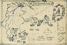 San Juan's port facilities were extremely small and rudimentary, consisting of a mooring wall built by the Spanish on "a little yland of stones, not past three feet aboue water in the highest place, and not past a bow-shotte ouer any way at the most, and it standeth from the maine land, two bowshootes or more".[17] As it would be difficult to accommodate both fleets in the anchorage, Hawkins sent a message to the Spanish fleet asking for an agreement on how the two fleets should treat each other, in order to avoid confrontation.[15]