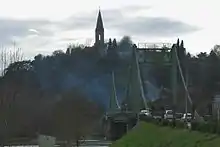 At Gennes, to the west of Saumur, there was no sign of combat troops until the 19th when Wehrmacht scouts arrived in the afternoon and early evening. As motor cyclists approached, the suspension bridge to the north of the island was blown. The 11th century church of St Eusèbe, on the high ground overlooking the bridge was an excellent view point[1]:104 and a good location for another of the 25 mm guns, however at 8pm on the evening of 19 June, 50 German troop carriers arrived on the north bank packed with assault troops. Artillery began to bombard the island and Gennes, destroying the tower of St Eusèbe and setting buildings in the town on fire.[1]:106 The Wehrmacht then assaulted the island in the river using rubber boats but were repelled by the Cadets and Algerian riflemen by midnight. An engineer, worried that his charges might be damaged by another bombardment, without orders, blew the southern bridge, isolating the troops on the island. The wounded had to be evacuated by boat.