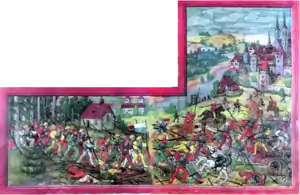 ![]() Depiction of the battle from the Chronicles of Lucerne (1511 – 1513). The Swiss arrive on the left; the battle itself is shown on the bottom right, and the top right shows the flight of the Swabian soldiers to Constance. | |||||||