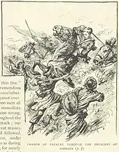 None of the trapped Sikh soldiers attempted to surrender. Many detachments, including one led by Sham Singh Attariwala, fought to the death.[6] Some Sikhs rushed forward to attack the British regiments sword in hand; others tried to ford or swim the river. British horse artillery lined the bank of the river and continued to fire into the crowds in the water. By the time the firing ceased, the Sikhs had lost between 8,000 and 10,000 men.[7] The British had also captured 67 guns.