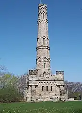 Battlefield House remains from the time of the battle, and is a museum located within Battlefield Park. They are located very near the site of the battle and, with a knoll across the street where a separate monument stands, comprises Battle of Stoney Creek National Historic Site.[38][39] The park's stone tower, was dedicated exactly 100 years after the battle. It was unveiled following a signal given by Queen Mary in England, via the transatlantic telegraph cable, and commemorates British soldiers who died in the fight. The Gage farm house is also preserved and serves as a museum. The battle is re-enacted annually on the weekend closest to 6 June.[40] The 2016 event was the 35th such re-enactment.[41]