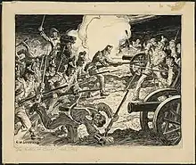 Around the same time, a group of Vincent's staff officers who had come forward to watch the action let out a cheer.[19] Their men took up the cheer, relieving their tension but depriving them of the element of surprise that was their primary advantage given the lopsided number of troops they faced. Instead of striking fear in their adversaries, the yells served to direct their attention to where the British were, helping the rousing troops to focus their attention and musket fire and making it nearly impossible for officers' orders to be heard above the din. Any hope of catching the Americans unaware and bayoneting them in their sleep was now lost and the British fixed their flints to their muskets and attacked. Lieutenant James Fitzgibbon and three sergeants of the Light Company of the 49th were able to keep their men from taking up the shout "until a late stage of the affair, when firing on our side became general".[20] Gradually, the American troops began to recover from the initial surprise, recover their poise and start firing at the attacking British, at times from as far away as 200 yards (180 m). The American artillery also entered the fray after having previously been rendered useless due to the dampness settling into the powder.[21]