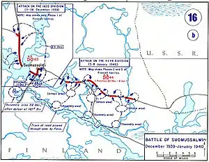 The Battle of Suomussalmi was a battle fought between Finnish and Soviet forces in the Winter War. The action took place from 30 November 1939 to 8 January 1940. The outcome was a Finnish victory against superior forces. This battle is considered the clearest, most important, and most significant Finnish victory in the northern half of Finland.[4] In Finland, the battle is still seen today as a symbol of the entirety of the Winter War itself.