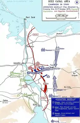 On October 14, immediately following the Egyptian offensive, Israeli Chief of Staff David Elazar presented the general outlines of a crossing operation of the Suez Canal to the Israeli cabinet in a meeting in Tel Aviv. Elazar emphasized the military and political gains of the operation, and the expected collapse that would occur in the Egyptian forces on the east bank when their supply routes became threatened. Elazar received unanimous support from the cabinet. Later that day, Bar-Lev headed a meeting attended by the senior and main division commanders in the Sinai theatre: Major Generals Abraham Adan, Ariel Sharon and Kalman Magen. Bar-Lev informed the Israeli officers of the decision to begin the crossing operation on the night of October 15/16, and assigned duties and responsibilities to the division commanders.[8][9][10]