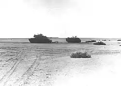 The 1st Brigade had just 33 tanks remaining after losing 20 tanks.[39][60][61] This prompted Second Army command to transfer a battalion of 21 tanks on October 18 from the 2nd Infantry Division to the north to reinforce the dwindling tank numbers in 16th Division's bridgehead. As the battalion moved south, a large number of Israeli aircraft attacked the formation, forcing it to undertake evasive maneuvers, turning eastwards and fanning out in the desert terrain, thereby avoiding losses. The battalion was then attached to the 21st Division.[62]