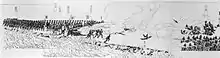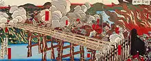 Sasaki ordered his men to charge the Satsuma gunners, but since the Mimawarigumi was armed only with spears and swords, his men were killed en masse.[16] However, the Kuwana forces and a unit under Kubota Shigeaki held their ground, making the skirmish rage on inconclusively.[17] The Shogunate troops set fire to various houses as they retreated, but that allowed Satsuma snipers to aim more easily. The situation stabilized during the night, as troops from Kuwana arrived in reinforcement.[14]