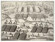 Varax had under his command four infantry units: the Tercio of Naples led by the Marquis of Treviso, the Germans under the Count of Sulz, and two Walloon and Burgundian regiments under the Comtes de Hachicourt and de Barlaymont.[13] The cavalry under Nicolo Basta comprised four squadrons of Spanish horse commanded by Juan de Cordova, Alonzo de Mendoza, Juan de Guzman and Alonzo Mondragon, and a Flemish unit under de Grubbendonck.[12] These were split into two units, one of heavy demi-lancers and the other of lighter herreruelos (harquebusiers).[14]
