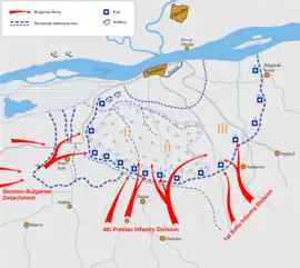 The battle strength of these forces consisted of 31 infantry and reserve battalions, 29 batteries and 7 squadrons or a total of around 55,000 men with 132 artillery pieces and 53 machine guns.[12][13] This ensured the initial numerical superiority of the attackers both in men and firepower, but most of the Bulgarian units, with the notable exception of the 1st Brigade of the 1st Sofia Infantry Division, did not have direct combat experience, as they did not take part in the Serbian Campaign. They had, however, profited from recent improvements in the Bulgarian Army, including the addition of more machine gun companies and heavy artillery as well as improved communications and logistical support.[6]