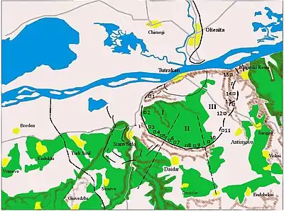 The main defensive line was constructed on the very edge of the plateau in order to keep enemy artillery away from any bridge that could be built to Turtucaia. The line stretched for almost 30 kilometers and had as its heart fifteen "centers of resistance", forts numbered from one to 15 and bearing the names of local settlements - "Turtucaia", "Staro Selo", "Daidâr", "Sarsânlar" etc. Each of these incorporated two shelters for 50 to 70 soldiers, with roofs supported by iron rails or wooden boards, on top of which a two-meter layer of earth was laid. Their profile was low, rising only about 60 centimeters, thus ensuring reasonable protection against field artillery shells.[7] Spaced from 1.2 to 2.2 kilometers apart, the individual forts were linked by shallow trenches and machine gun nests, which were in turn connected via communication trenches to the rear of the main defensive line. The intervening spaces were further covered by rifle and machine gun positions in the flanks of the forts. The "centers of resistance" were well protected by barbed wire obstacles that reached a depth of 10 to 15 meters, but they were placed some 50 metres away from the firing line and thus could not be defended with hand grenades. A hundred meters in front of the main line the Romanians had built three rows of pitfalls and barbed wire that ran continuously from fort 15 to fort 3.[8] Most of the artillery was placed in the main defensive line, although several pieces, along with trenches and machine guns, were placed on the nearby islands of the Danube in order to support the Romanian Danube Flotilla, which was tasked with providing artillery cover on the western approaches to the fortress.[7]