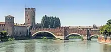 Directly east of Verona was the suburb of Veronetta, which the Austrians had heavily fortified. In addition, the bridges between Verona and Veronetta were well-covered by Austrian artillery. Therefore, Masséna turned his eyes to the west side of Verona, to the suburb of San Giorgio, which was accessible by a stone bridge[15] known as the Castelvecchio Bridge (Ponte di Castelvecchio).[16] Vukassovich was responsible for defending the area. The Austrian division commander had a wall built across the center of the bridge and fortified San Giorgio. However, Vukassovich only allocated two battalions to its defense. He deployed six battalions in the hills northeast of Verona, while the remainder of his division lay farther north, maintaining contact with Hiller's corps.[17]